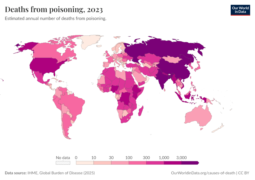 IHME, Global Burden of Disease (2025) – with major processing by Our World in Data. “Deaths from poisoning” [dataset]. IHME, Global Burden of Disease, “Global Burden of Disease - Deaths” [original data]. Retrieved March 13, 2026 from https://admin-refresh-dis.owid.pages.dev/grapher/deaths-from-poisoning