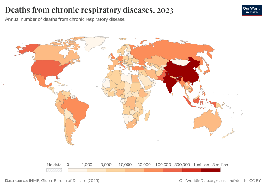 IHME, Global Burden of Disease (2025) – with major processing by Our World in Data. “Deaths from chronic respiratory diseases” [dataset]. IHME, Global Burden of Disease, “Global Burden of Disease - Deaths” [original data]. Retrieved March 13, 2026 from https://admin-refresh-dis.owid.pages.dev/grapher/deaths-from-respiratory-disease