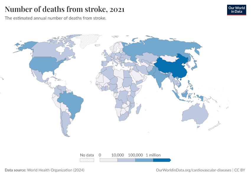 World Health Organization (2024) – with major processing by Our World in Data. “Number of deaths from stroke” [dataset]. World Health Organization, “Global Health Estimates” [original data]. Retrieved March 13, 2026 from https://admin-refresh-dis.owid.pages.dev/grapher/deaths-from-strokes-ghe