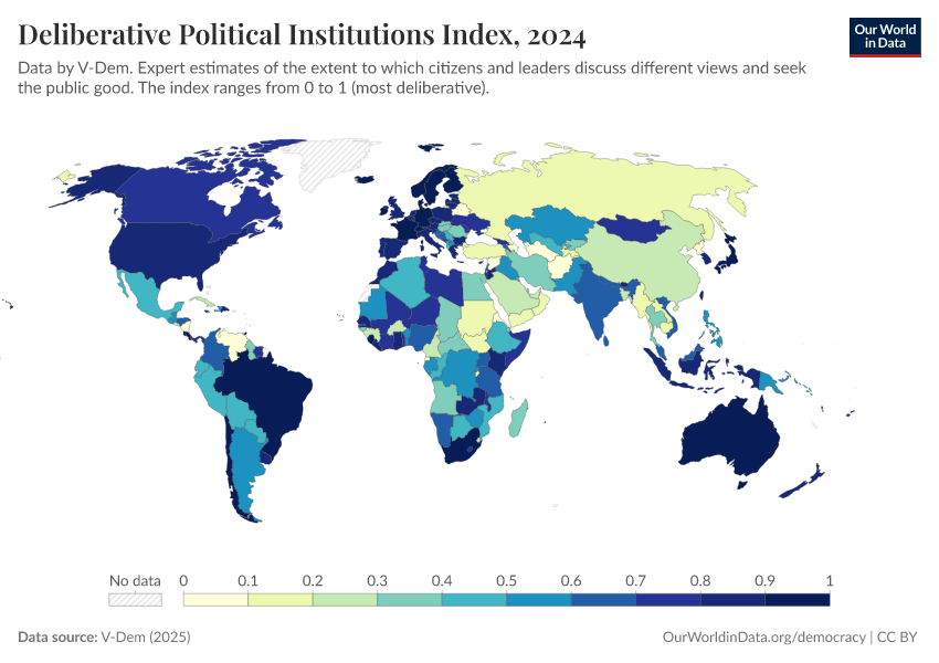 “Data Page: Deliberative political institutions index”, part of the following publication: Bastian Herre, Lucas Rodés-Guirao, and Esteban Ortiz-Ospina (2013) - “Democracy”. Data adapted from V-Dem. Retrieved from https://admin-refresh-dis.owid.pages.dev/grapher/deliberative-political-institutions-index [online resource]How to cite this data