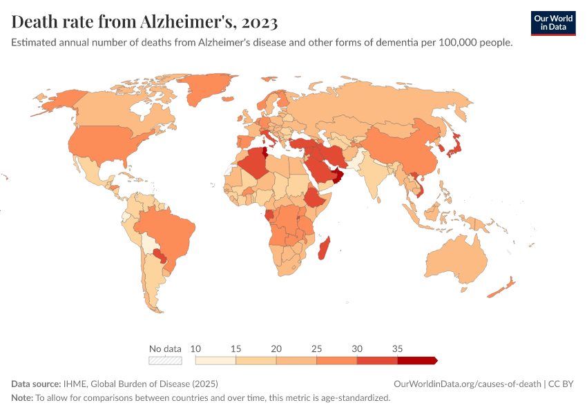 IHME, Global Burden of Disease (2025) – with major processing by Our World in Data. “Death rate from Alzheimer's” [dataset]. IHME, Global Burden of Disease, “Global Burden of Disease - Deaths” [original data]. Retrieved March 13, 2026 from https://admin-refresh-dis.owid.pages.dev/grapher/dementia-death-rates