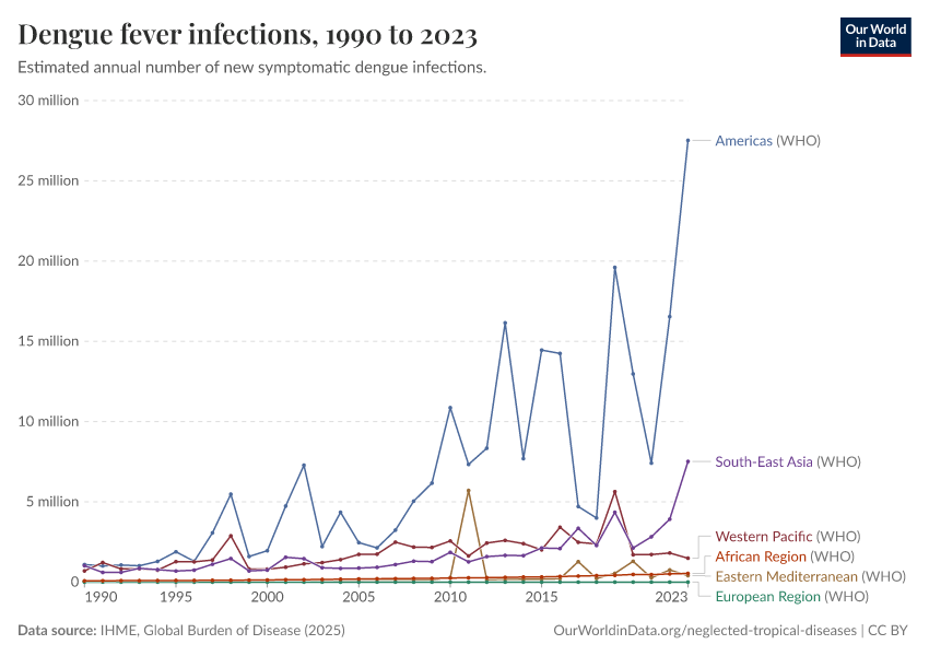 IHME, Global Burden of Disease (2025) – with major processing by Our World in Data. “Dengue fever infections” [dataset]. IHME, Global Burden of Disease, “Global Burden of Disease - Prevalence and Incidence” [original data]. Retrieved March 13, 2026 from https://admin-refresh-dis.owid.pages.dev/grapher/dengue-incidence