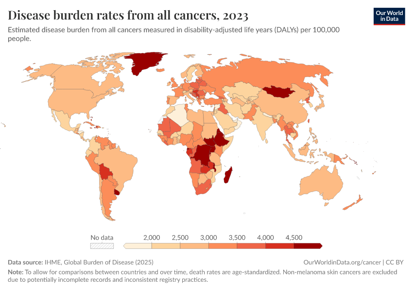 IHME, Global Burden of Disease (2025) – with major processing by Our World in Data. “Disease burden rates from all cancers” [dataset]. IHME, Global Burden of Disease, “Global Burden of Disease - DALYs” [original data]. Retrieved March 13, 2026 from https://admin-refresh-dis.owid.pages.dev/grapher/disease-burden-rates-from-cancers