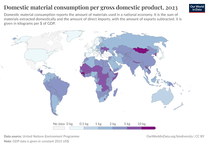 United Nations Environment Programme – processed by Our World in Data. “Domestic material consumption per gross domestic product” [dataset]. United Nations Environment Programme, “WESR / Global Material Flows Database” [original data]. Retrieved March 13, 2026 from https://admin-refresh-dis.owid.pages.dev/grapher/domestic-material-consumption-per-unit-of-gdp