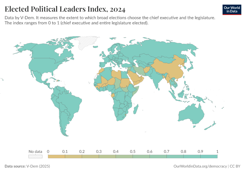 V-Dem (2025) – processed by Our World in Data. “Elected officials index” [dataset]. V-Dem, “Democracy report v15” [original data]. Retrieved March 13, 2026 from https://admin-refresh-dis.owid.pages.dev/grapher/elected-political-leaders-index
