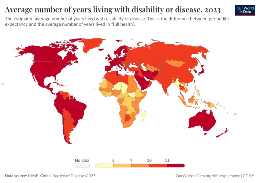 “Data Page: Average number of years living with disability or disease”, part of the following publication: Saloni Dattani, Lucas Rodés-Guirao, Hannah Ritchie, Esteban Ortiz-Ospina, and Max Roser (2023) - “Life Expectancy”. Data adapted from IHME, Global Burden of Disease. Retrieved from https://admin-refresh-dis.owid.pages.dev/grapher/expected-years-of-living-with-disability-or-disease-burden [online resource]How to cite this data