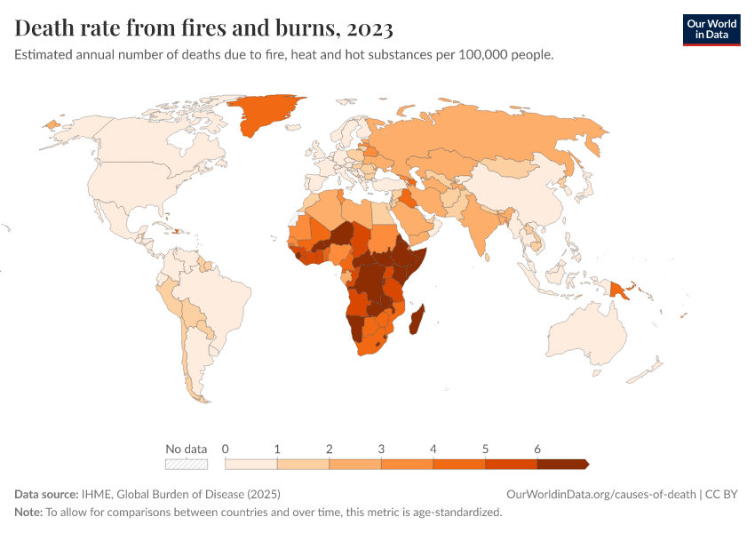 IHME, Global Burden of Disease (2025) – with major processing by Our World in Data. “Death rate from fires and burns” [dataset]. IHME, Global Burden of Disease, “Global Burden of Disease - Deaths” [original data]. Retrieved March 13, 2026 from https://admin-refresh-dis.owid.pages.dev/grapher/fire-death-rates