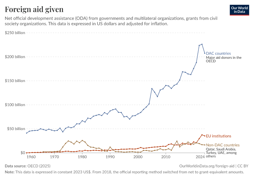 OECD (2025) – with major processing by Our World in Data. “Foreign aid given – Net disbursements” [dataset]. OECD, “OECD Official Development Assistance (ODA) - DAC1: Flows by provider (ODA+OOF+Private)”; OECD, “OECD Official Development Assistance (ODA) - DAC2A: Aid (ODA) disbursements to countries and regions” [original data]. Retrieved March 13, 2026 from https://admin-refresh-dis.owid.pages.dev/grapher/foreign-aid-given-net