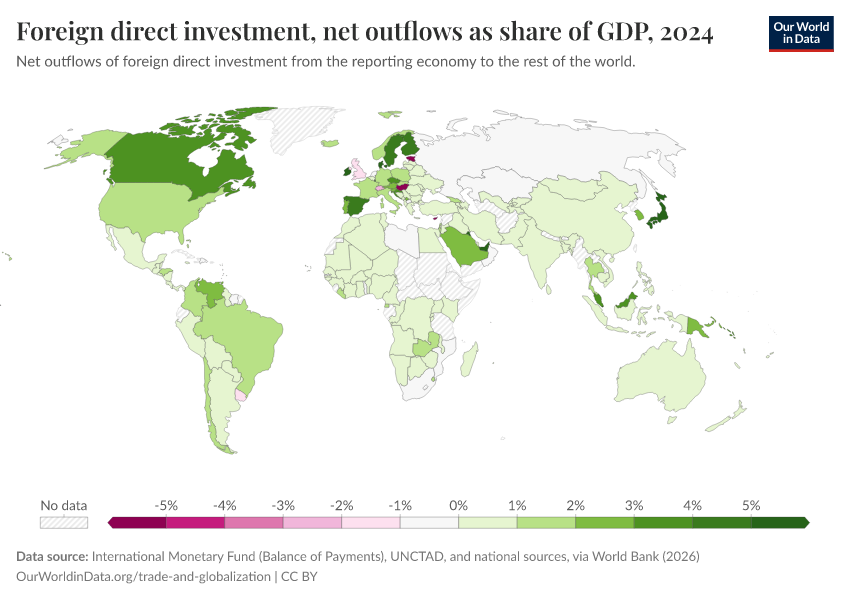 International Monetary Fund (Balance of Payments), UNCTAD, and national sources, via World Bank (2026) – processed by Our World in Data. “Foreign direct investment, net outflows as share of GDP” [dataset]. International Monetary Fund (Balance of Payments), UNCTAD, and national sources, via World Bank, “World Development Indicators 125” [original data]. Retrieved March 13, 2026 from https://admin-refresh-dis.owid.pages.dev/grapher/foreign-direct-investment-net-outflows-as-share-of-gdp