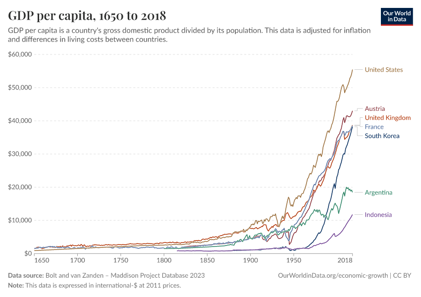 “Data Page: GDP per capita”, part of the following publication: Max Roser, Bertha Rohenkohl, Pablo Arriagada, Joe Hasell, Hannah Ritchie, and Esteban Ortiz-Ospina (2023) - “Economic Growth”. Data adapted from Bolt and van Zanden. Retrieved from https://admin-refresh-dis.owid.pages.dev/grapher/gdp-per-capita-maddison-project-database [online resource]