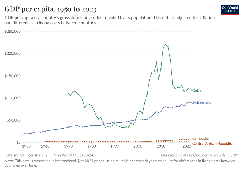 “Data Page: GDP per capita”, part of the following publication: Max Roser, Bertha Rohenkohl, Pablo Arriagada, Joe Hasell, Hannah Ritchie, and Esteban Ortiz-Ospina (2023) - “Economic Growth”. Data adapted from Feenstra et al.. Retrieved from https://admin-refresh-dis.owid.pages.dev/grapher/gdp-per-capita-penn-world-table [online resource]How to cite this data