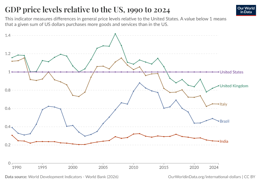 “Data Page: GDP price levels relative to the US”, part of the following publication: Max Roser, Bertha Rohenkohl, Pablo Arriagada, Joe Hasell, Hannah Ritchie, and Esteban Ortiz-Ospina (2023) - “Economic Growth”. Data adapted from World Development Indicators - World Bank. Retrieved from https://admin-refresh-dis.owid.pages.dev/grapher/gdp-price-levels-relative-to-the-us [online resource]How to cite this data