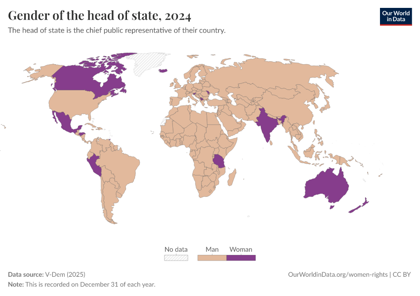V-Dem (2025) – processed by Our World in Data. “Gender of the head of state” [dataset]. V-Dem, “Democracy report v15” [original data]. Retrieved March 13, 2026 from https://admin-refresh-dis.owid.pages.dev/grapher/gender-of-the-head-of-state