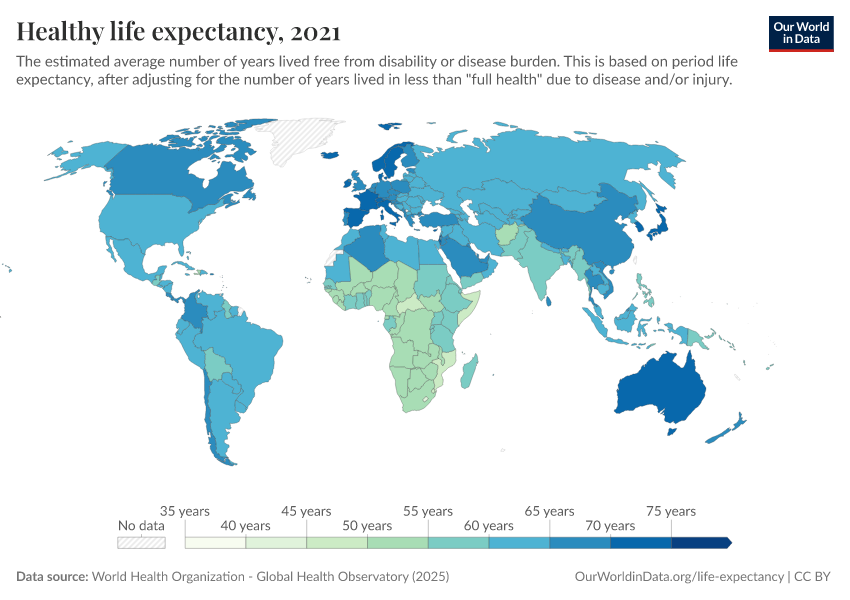 “Data Page: Healthy life expectancy”. Our World in Data (2026). Data adapted from World Health Organization. Retrieved from https://admin-refresh-dis.owid.pages.dev/grapher/healthy-life-expectancy-at-birth [online resource]How to cite this data