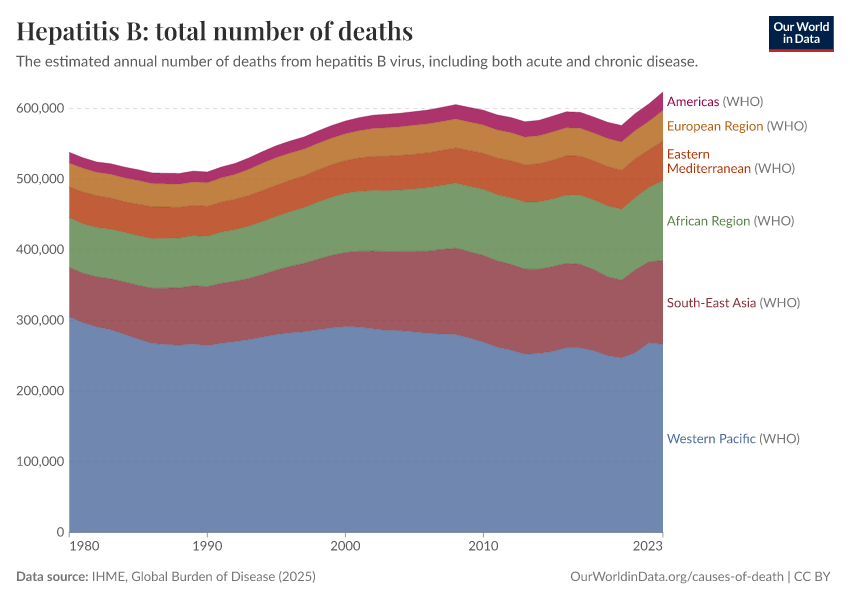 IHME, Global Burden of Disease (2025) – with major processing by Our World in Data. “Hepatitis B: total number of deaths” [dataset]. IHME, Global Burden of Disease, “Global Burden of Disease - Deaths” [original data]. Retrieved March 13, 2026 from https://admin-refresh-dis.owid.pages.dev/grapher/hepatitis-b-number-of-deaths