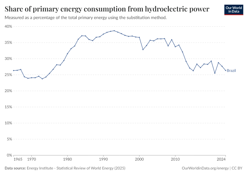 Energy Institute - Statistical Review of World Energy (2025) – with major processing by Our World in Data. “Share of primary energy consumption that comes from hydropower – Using the substitution method” [dataset]. Energy Institute, “Statistical Review of World Energy” [original data]. Retrieved March 13, 2026 from https://admin-refresh-dis.owid.pages.dev/grapher/hydro-share-energy