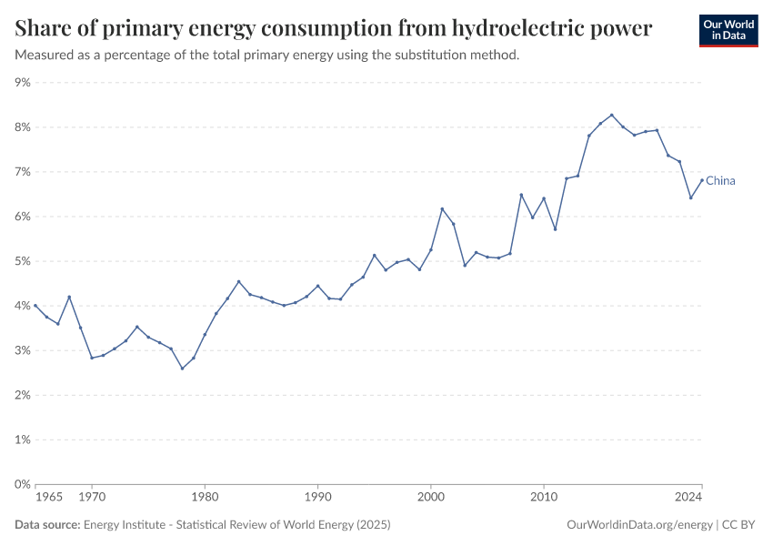 Energy Institute - Statistical Review of World Energy (2025) – with major processing by Our World in Data. “Share of primary energy consumption that comes from hydropower – Using the substitution method” [dataset]. Energy Institute, “Statistical Review of World Energy” [original data]. Retrieved March 13, 2026 from https://admin-refresh-dis.owid.pages.dev/grapher/hydro-share-energy