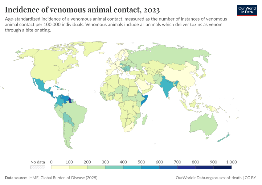 “Data Page: Incidence of venomous animal contact”, part of the following publication: Esteban Ortiz-Ospina and Max Roser (2016) - “Global Health”. Data adapted from IHME, Global Burden of Disease. Retrieved from https://admin-refresh-dis.owid.pages.dev/grapher/incidence-of-venomous-animal-contact [online resource]How to cite this data