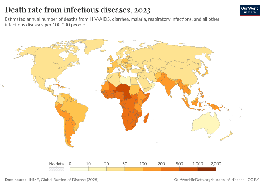 IHME, Global Burden of Disease (2025) – with major processing by Our World in Data. “Death rate from infectious diseases” [dataset]. IHME, Global Burden of Disease, “Global Burden of Disease - Deaths” [original data]. Retrieved March 13, 2026 from https://admin-refresh-dis.owid.pages.dev/grapher/infectious-disease-death-rates-gbd