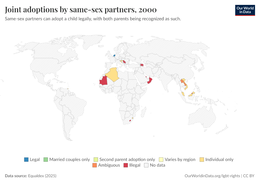 “Data Page: Joint adoptions by same-sex partners”, part of the following publication: Bastian Herre and Pablo Arriagada (2023) - “LGBT+ Rights”. Data adapted from Equaldex. Retrieved from https://admin-refresh-dis.owid.pages.dev/grapher/joint-adoptions-same-sex-partners-equaldex [online resource]