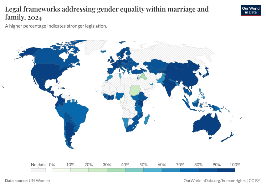UN Women – processed by Our World in Data. “Legal frameworks addressing gender equality within marriage and family” [dataset]. UN Women, “UN Women” [original data]. Retrieved March 13, 2026 from https://admin-refresh-dis.owid.pages.dev/grapher/legal-frameworks-gender-equality-within-marriage-and-family