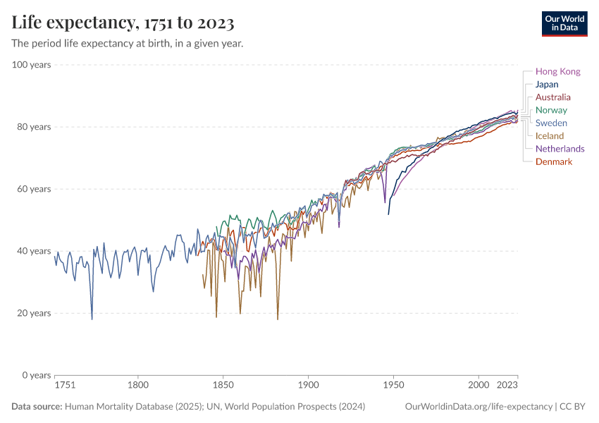 “Data Page: Life expectancy at birth”, part of the following publication: Saloni Dattani, Lucas Rodés-Guirao, Hannah Ritchie, Esteban Ortiz-Ospina, and Max Roser (2023) - “Life Expectancy”. Data adapted from Human Mortality Database, United Nations. Retrieved from https://admin-refresh-dis.owid.pages.dev/grapher/life-expectancy-hmd-unwpp [online resource]How to cite this data
