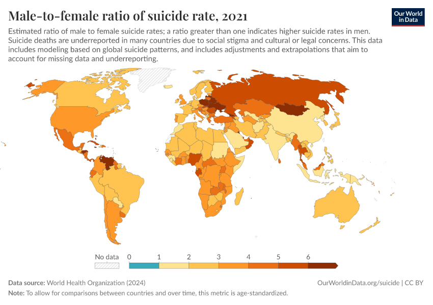 World Health Organization (2024) – with major processing by Our World in Data. “Male-to-female ratio of suicide rate” [dataset]. World Health Organization, “Global Health Estimates” [original data]. Retrieved March 13, 2026 from https://admin-refresh-dis.owid.pages.dev/grapher/male-female-ratio-suicides-rates