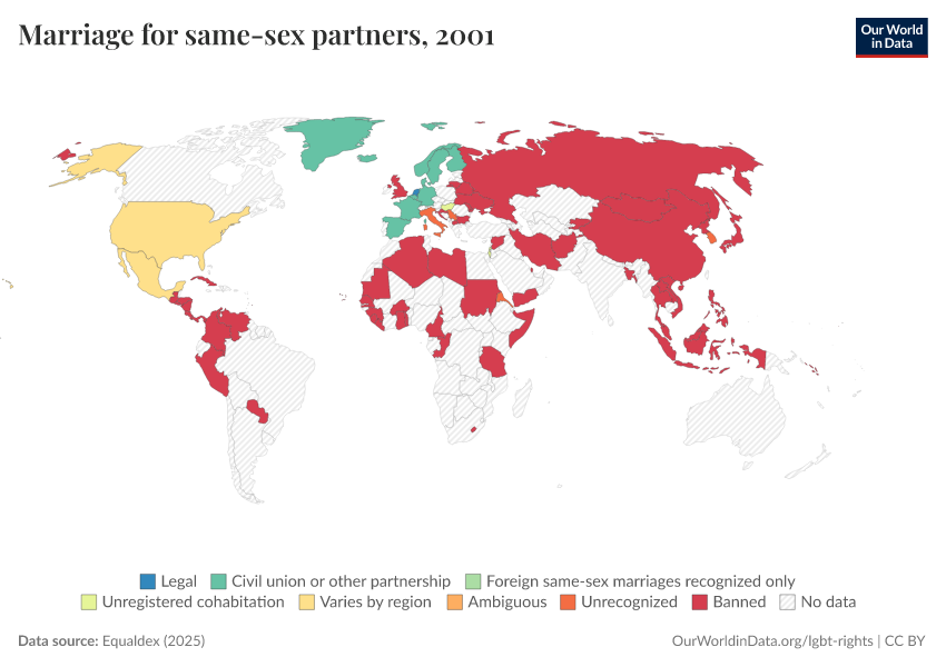 “Data Page: Marriage for same-sex partners”, part of the following publication: Bastian Herre and Pablo Arriagada (2023) - “LGBT+ Rights”. Data adapted from Equaldex. Retrieved from https://admin-refresh-dis.owid.pages.dev/grapher/marriage-same-sex-partners-equaldex [online resource]