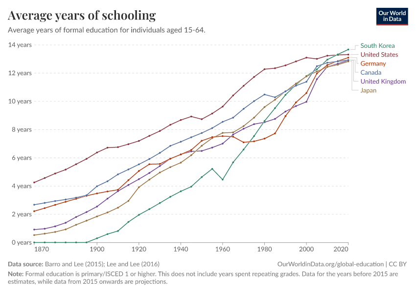 Barro and Lee (2015); Lee and Lee (2016) – with major processing by Our World in Data. “Average years of schooling” [dataset]. Barro and Lee, “Projections of Educational Attainment”; Lee and Lee, “Human Capital in the Long Run” [original data]. Retrieved March 13, 2026 from https://admin-refresh-dis.owid.pages.dev/grapher/mean-years-of-schooling-long-run