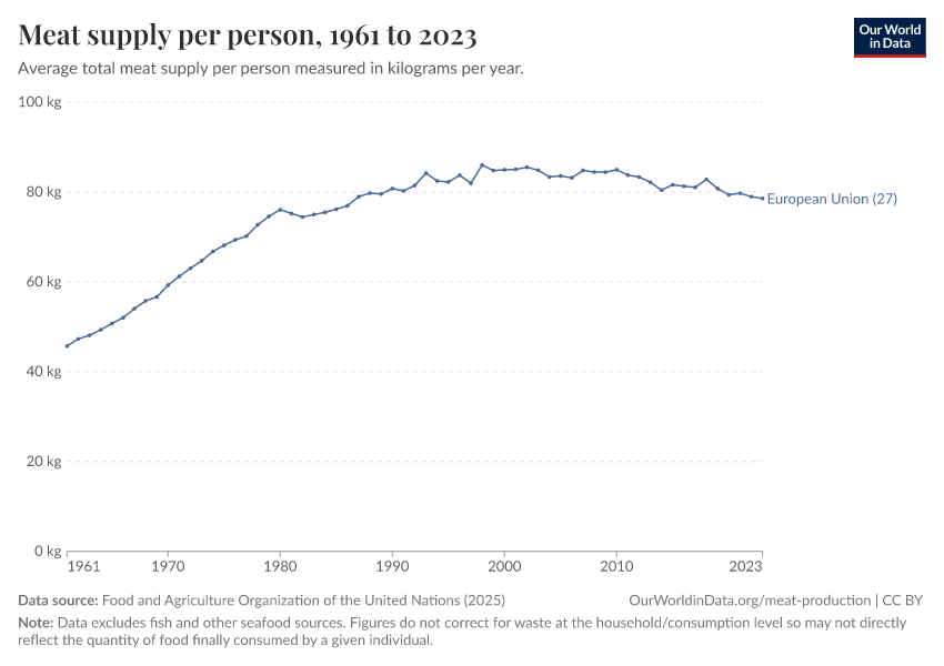 Food and Agriculture Organization of the United Nations (2025) – processed by Our World in Data. “Yearly per capita supply of all meat” [dataset]. Food and Agriculture Organization of the United Nations, “Food Balances: Food Balances (-2013, old methodology and population)”; Food and Agriculture Organization of the United Nations, “Food Balances: Food Balances (2010-)” [original data]. Retrieved March 13, 2026 from https://admin-refresh-dis.owid.pages.dev/grapher/meat-supply-per-person