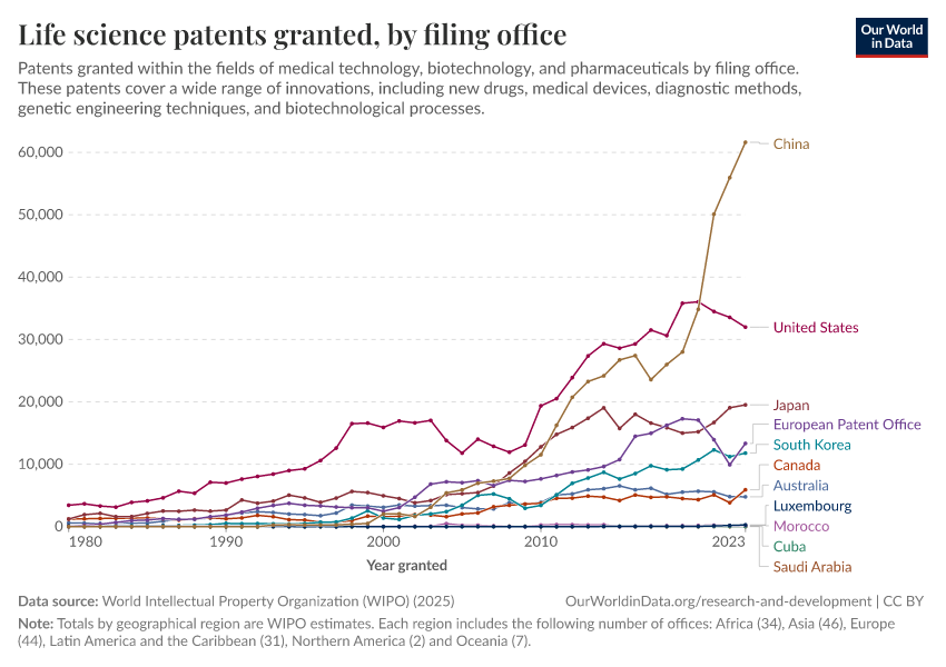 “Data Page: Life science patents granted, by filing office”, part of the following publication: Tuna Acisu, Saloni Dattani, Fiona Spooner, Veronika Samborska, Hannah Ritchie, and Max Roser (2025) - “Medicine and Biotechnology”. Data adapted from World Intellectual Property Organization (WIPO). Retrieved from https://admin-refresh-dis.owid.pages.dev/grapher/medicine-and-biotechnology-patents-granted-by-filing-office [online resource]How to cite this data