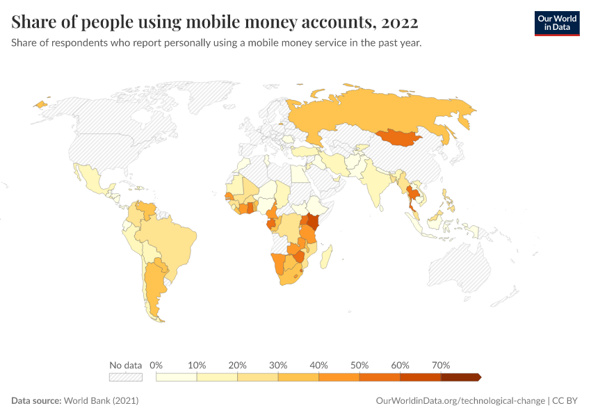 “Data Page: Share of people using mobile money accounts”, part of the following publication: Max Roser, Bertha Rohenkohl, Pablo Arriagada, Joe Hasell, Hannah Ritchie, and Esteban Ortiz-Ospina (2023) - “Economic Growth”. Data adapted from World Bank. Retrieved from https://admin-refresh-dis.owid.pages.dev/grapher/mobile-money-account-usage [online resource]How to cite this data