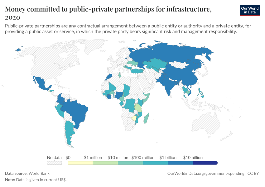 “Data Page: Money committed to public-private partnerships for infrastructure”. Our World in Data (2026). Data adapted from World Bank. Retrieved from https://admin-refresh-dis.owid.pages.dev/grapher/money-committed-to-public-private-partnerships-for-infrastructure [online resource]How to cite this data