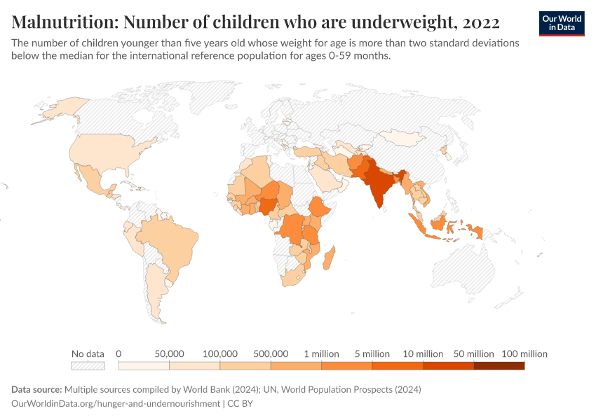 Multiple sources compiled by World Bank (2024); UN, World Population Prospects (2024) – processed by Our World in Data. “Number of underweight children – UN WPP” [dataset]. UNICEF, WHO, World Bank, “World Development Indicators”; United Nations, “World Population Prospects” [original data]. Retrieved March 13, 2026 from https://admin-refresh-dis.owid.pages.dev/grapher/number-of-children-who-are-underweight