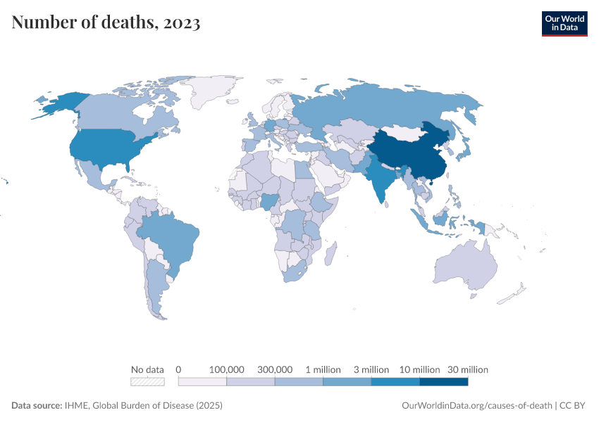 “Data Page: Number of deaths”, part of the following publication: Esteban Ortiz-Ospina and Max Roser (2016) - “Global Health”. Data adapted from IHME, Global Burden of Disease. Retrieved from https://admin-refresh-dis.owid.pages.dev/grapher/number-of-deaths-gbd [online resource]How to cite this data