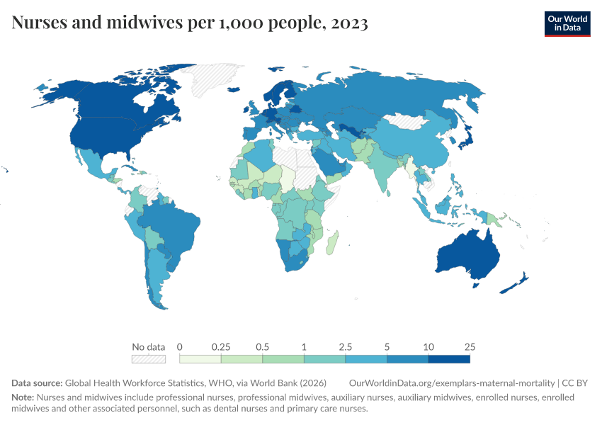 “Data Page: Nurses and midwives per 1,000 people”. Our World in Data (2026). Data adapted from Global Health Workforce Statistics, WHO, via World Bank. Retrieved from https://admin-refresh-dis.owid.pages.dev/grapher/nurses-and-midwives-per-1000-people [online resource]How to cite this data