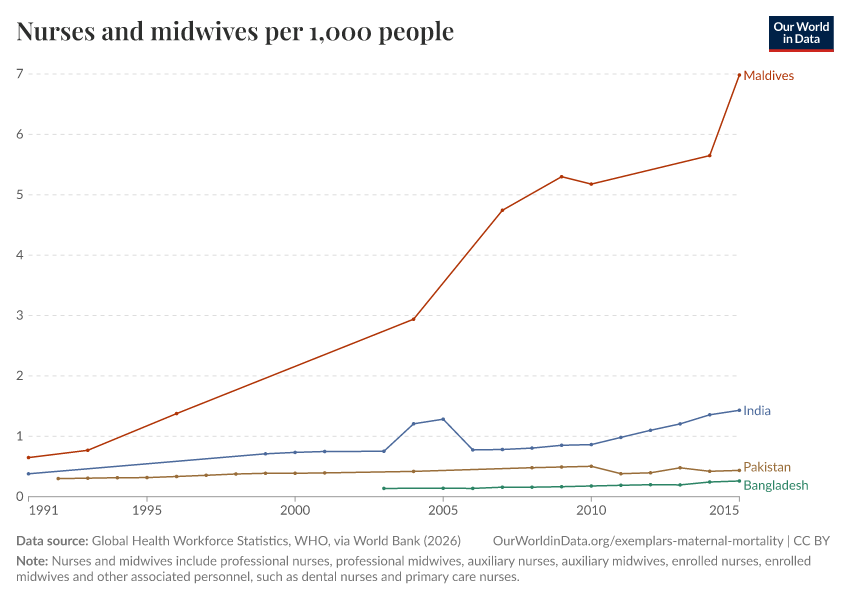 “Data Page: Nurses and midwives per 1,000 people”. Our World in Data (2026). Data adapted from Global Health Workforce Statistics, WHO, via World Bank. Retrieved from https://admin-refresh-dis.owid.pages.dev/grapher/nurses-and-midwives-per-1000-people [online resource]