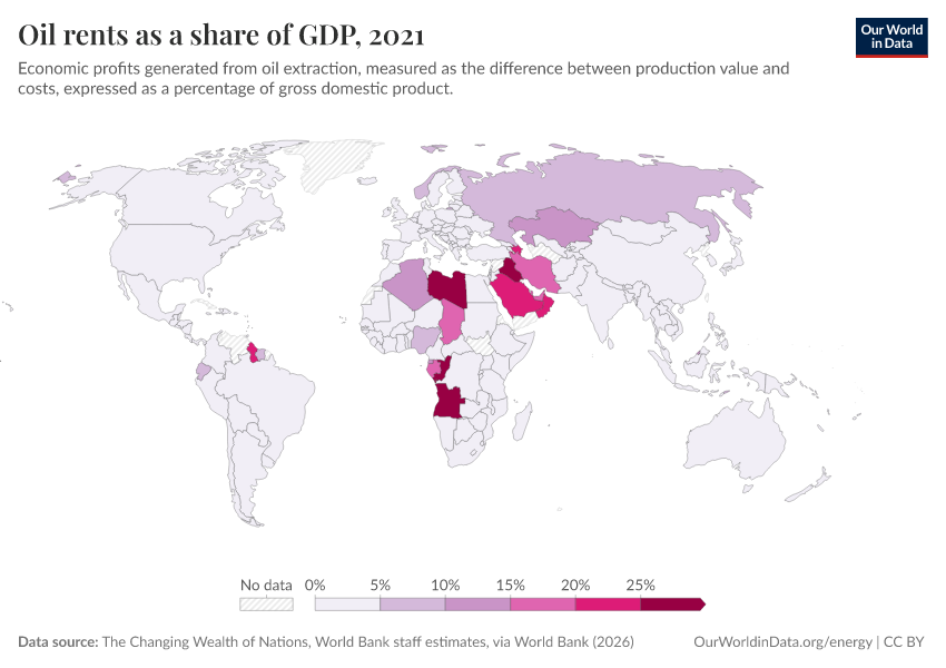 The Changing Wealth of Nations, World Bank staff estimates, via World Bank (2026) – processed by Our World in Data. “Oil rents as a share of GDP” [dataset]. The Changing Wealth of Nations, World Bank staff estimates, via World Bank, “World Development Indicators 125” [original data]. Retrieved March 13, 2026 from https://admin-refresh-dis.owid.pages.dev/grapher/oil-rents-as-a-share-of-gdp