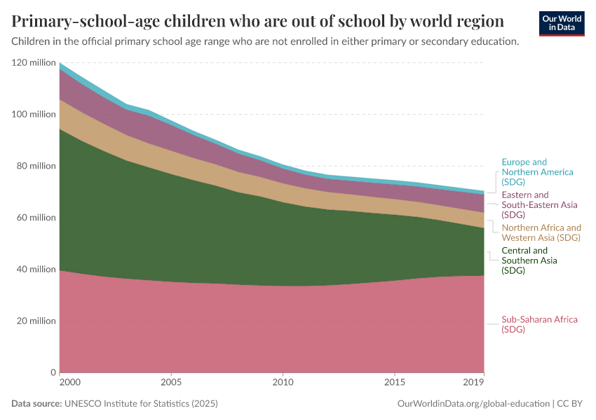 “Data Page: Out-of-school children of primary school age”, part of the following publication: Hannah Ritchie, Veronika Samborska, Esteban Ortiz-Ospina, and Max Roser (2023) - “Global Education”. Data adapted from UNESCO Institute for Statistics. Retrieved from https://admin-refresh-dis.owid.pages.dev/grapher/out-of-school-children-of-primary-school-age-by-world-region [online resource]How to cite this data