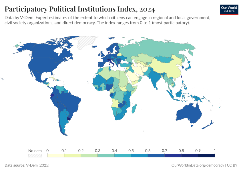 “Data Page: Participatory political institutions”, part of the following publication: Bastian Herre, Lucas Rodés-Guirao, and Esteban Ortiz-Ospina (2013) - “Democracy”. Data adapted from V-Dem. Retrieved from https://admin-refresh-dis.owid.pages.dev/grapher/participatory-political-institutions-index [online resource]How to cite this data
