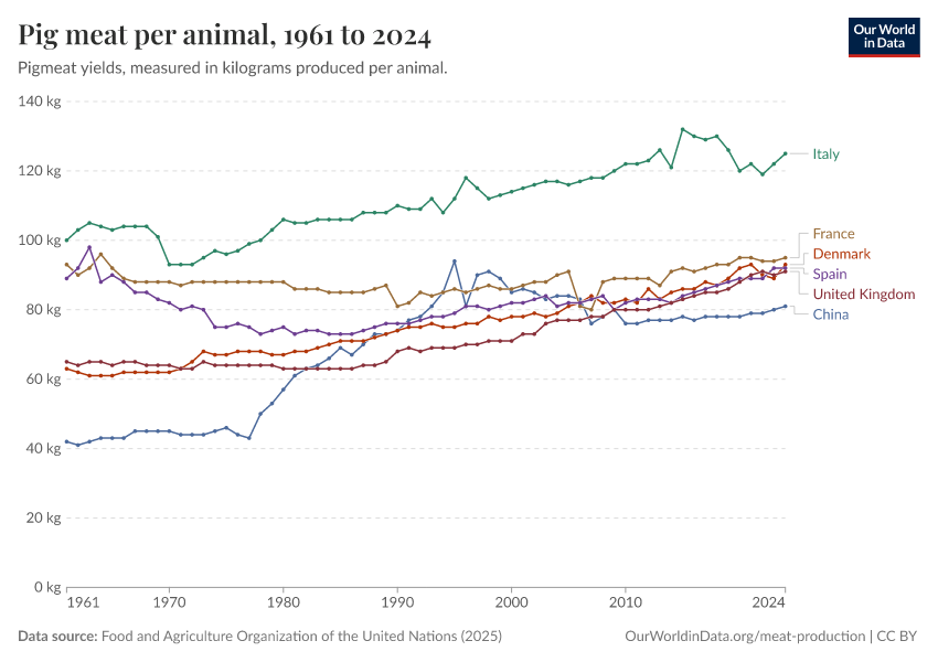 Food and Agriculture Organization of the United Nations (2025) – with major processing by Our World in Data. “Pig meat yield per animal – UN FAO” [dataset]. Food and Agriculture Organization of the United Nations, “Production: Crops and livestock products” [original data]. Retrieved March 13, 2026 from https://admin-refresh-dis.owid.pages.dev/grapher/pig-yields-meat-per-animal-in-hectograms-100-grams