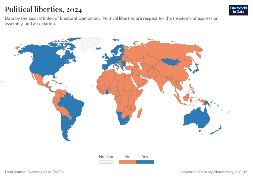 Skaaning et al. (2025) – processed by Our World in Data. “Political liberties” [dataset]. Skaaning et al., “Lexical Index of Electoral Democracy (LIED) v6.8” [original data]. Retrieved March 13, 2026 from https://admin-refresh-dis.owid.pages.dev/grapher/political-liberties-lexical