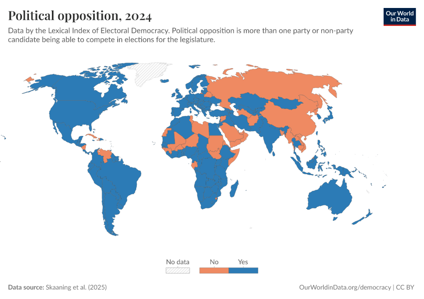Skaaning et al. (2025) – processed by Our World in Data. “Political opposition” [dataset]. Skaaning et al., “Lexical Index of Electoral Democracy (LIED) v6.8” [original data]. Retrieved March 13, 2026 from https://admin-refresh-dis.owid.pages.dev/grapher/political-opposition-lexical