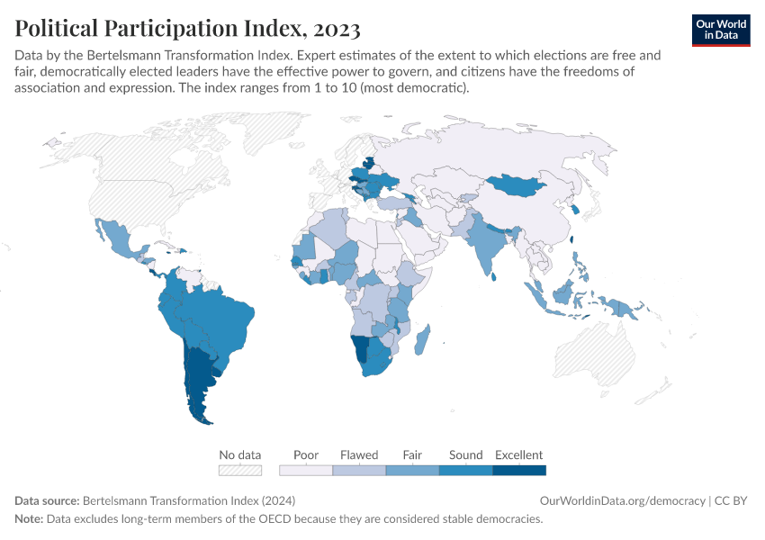 Bertelsmann Transformation Index (2024) – processed by Our World in Data. “Political Participation Index” [dataset]. Bertelsmann Transformation Index, “Bertelsmann Transformation Index, Scores” [original data]. Retrieved March 13, 2026 from https://admin-refresh-dis.owid.pages.dev/grapher/political-participation-index-bti