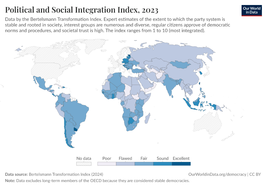 “Data Page: Political and Social Integration Index”, part of the following publication: Bastian Herre, Lucas Rodés-Guirao, and Esteban Ortiz-Ospina (2013) - “Democracy”. Data adapted from Bertelsmann Transformation Index. Retrieved from https://admin-refresh-dis.owid.pages.dev/grapher/political-social-integration-index-bti [online resource]How to cite this data