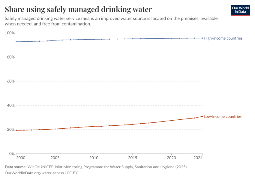 WHO/UNICEF Joint Monitoring Programme for Water Supply, Sanitation and Hygiene (2025) – processed by Our World in Data. “Share using safely managed drinking water” [dataset]. World Health Organization/UNICEF Joint Monitoring Programme for Water Supply, Sanitation and Hygiene, “WHO/UNICEF Joint Monitoring Programme for Water Supply, Sanitation and Hygiene (JMP) 2000-2024 report” [original data]. Retrieved March 13, 2026 from https://admin-refresh-dis.owid.pages.dev/grapher/proportion-using-safely-managed-drinking-water