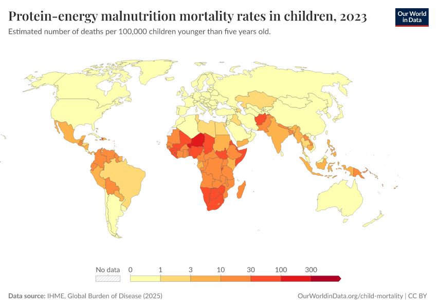 IHME, Global Burden of Disease (2025) – with major processing by Our World in Data. “Protein-energy malnutrition mortality rates in children ” [dataset]. IHME, Global Burden of Disease, “Global Burden of Disease - Deaths” [original data]. Retrieved March 13, 2026 from https://admin-refresh-dis.owid.pages.dev/grapher/protein-energy-malnutrition-mortality-rates-in-children