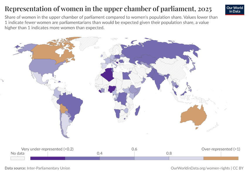“Data Page: Representation of women in the upper chamber of parliament”. Our World in Data (2026). Data adapted from Inter-Parliamentary Union. Retrieved from https://admin-refresh-dis.owid.pages.dev/grapher/representation-of-women-in-the-upper-chamber-of-parliament [online resource]How to cite this data