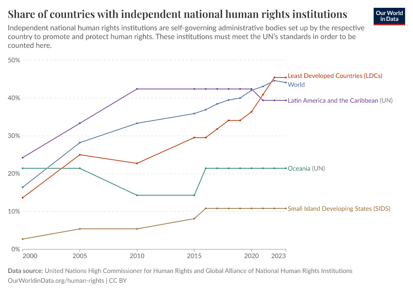 United Nations High Commissioner for Human Rights and Global Alliance of National Human Rights Institutions – processed by Our World in Data. “Share of countries with independent national human rights institutions” [dataset]. United Nations High Commissioner for Human Rights and Global Alliance of National Human Rights Institutions, “Source: The Office of the United Nations High Commissioner for Human Rights (OHCHR) in collaboration with Global Alliance of National Human Rights Institutions (GANHRI).” [original data]. Retrieved March 13, 2026 from https://admin-refresh-dis.owid.pages.dev/grapher/share-countries-accredited-independent-national-human-rights-institutions