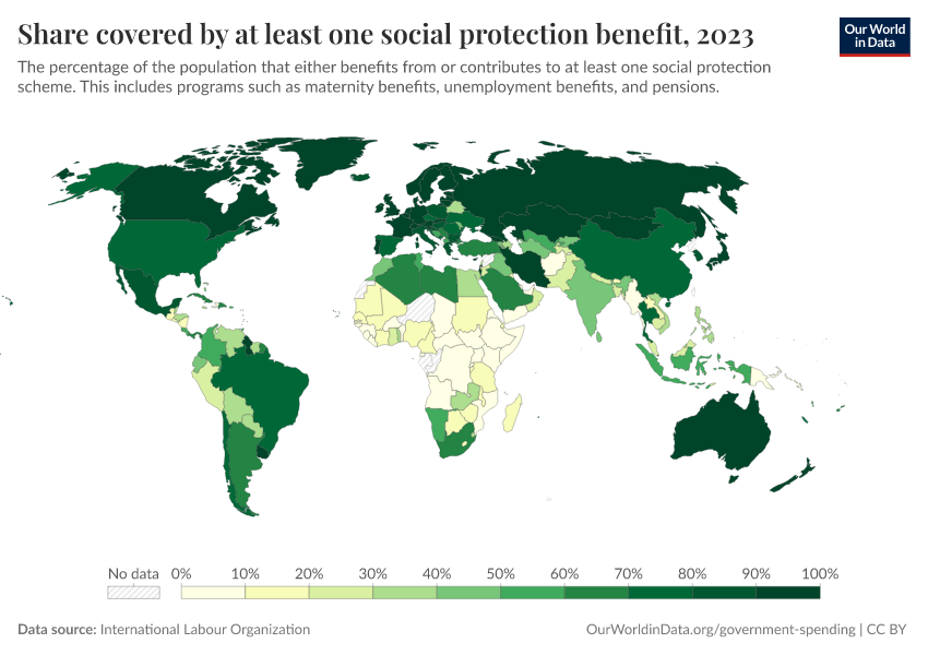 “Data Page: Share covered by at least one social protection benefit”. Our World in Data (2026). Data adapted from International Labour Organization. Retrieved from https://admin-refresh-dis.owid.pages.dev/grapher/share-covered-by-one-social-protection-benefit [online resource]How to cite this data